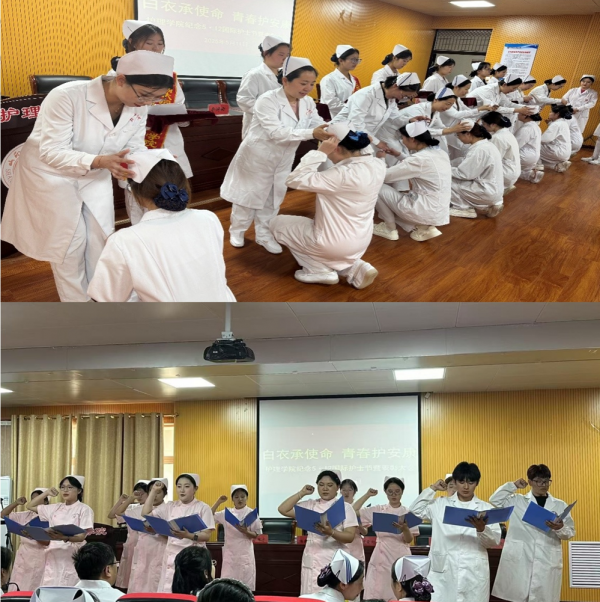 德育铸魂,传承南丁格尔精神,筑牢职业信仰。以“5・12国际护士节”为契机,学院深耕职业精神培育。“白衣诵初心”朗诵会上,以《生命的守护者:护士之歌》等作品重现护理先辈“燃烧自己、照亮他人”的奉献史。8名教师在表彰大会上为学生代表庄严授帽,全体齐诵《南丁格尔誓言》,誓言铿锵中,“敬佑生命”的职业信念深深扎根。活动同步表彰“优秀带教老师”“志愿先锋”,以榜样力量引领学子践行“大爱无疆”,让德育从“理论灌输”变为“精神共鸣”。